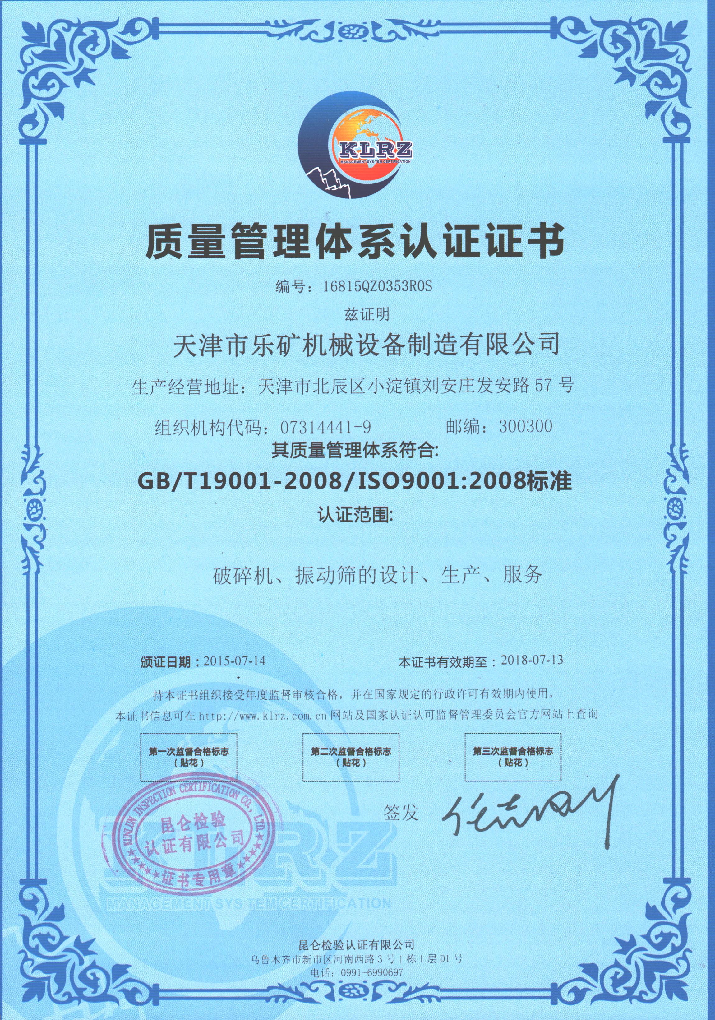 In July 3, 2015, The Association two experts of Quality Assurance Center   visited our company,Conduct on-site assessment of the company's quality management system certification.After  the expert group careful examination , company of the audit projects have reached the ISO9000 quality management system standards, successfully passed the quality management system audit.We work to pay the strict implementation of quality management system and regulations  in the future, in strict accordance with the standards of production, continuously improve the quality of products, to provide high quality products and services for the mining industry!