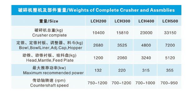 生產能力表可作為LCH 圓錐破碎機初步選型的工具,表中數據適用于松散密度1.6t/m3 的給料、給料中篩出小于排礦口粒級、開路作業條件下的生產能力。在給料中細粒級含量較高、閉路作業條件下,設備能力比開路作業高15%- 30%。破碎機作為生產回路中的一個重要組成部分,其性能的發揮部分取決于給料機、皮帶機、振動篩、支撐結構、電動機、傳動裝置及料倉等輔件的正確選擇和操作。
