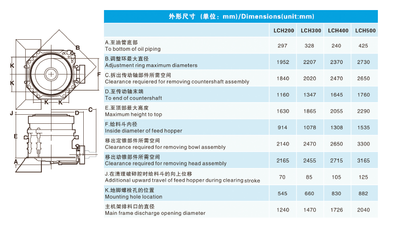 LCH 系列圓錐破碎機的銅套,在振動大、粉塵多的破碎環境里能夠提供更大的負載能力。LCH 系列圓錐破碎機所有零件都可以從頂部或側面拆裝和維護,動錐和定錐拆裝方便,無需拆解機架,無需重新緊固機架螺栓,因而LCH 系列圓錐破碎機日常更換襯板更便捷。